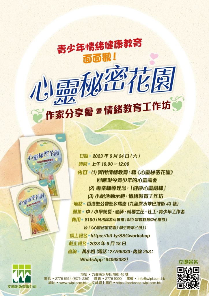 「心靈秘密花園」作家分享會暨情緒教育工作坊 宗教教育中心主辦「心靈秘密花園」作家分享會暨情緒教育工作坊為推動青少年情緒教育,培育健康心靈來面對逆境和成長的挑戰,本中心現已出版《心靈秘密花園》,並舉辦作家分享會暨情緒教育工作坊,由兩位作者張佩斯女士和姚錦雯博士分享推動青少年情緒教育的實務經驗與心得。日期:2023年6月24日(星期六)時間:上午10:00-中午12:00內容:(1) 實用情緒教育:藉《心靈秘密花園》回應現今青少年的心靈需要(2) 專業輔導理念:「健康心靈階梯」(3) 小組活動示範:情緒教育工作坊地點:香港聖公會聖多馬堂(九龍深水埗巴域街43號)對象:中/小學校長、老師、輔導主任、社工、青少年工作者費用:$100(凡出席者可獲贈「$50宗教教育中心禮券」及「《心靈秘密花園》學生範本乙份」)網上報名:https://bit.ly/SSGworkshop截止報名:2023年6月18日查詢:黃小姐(電話:27766333,內線253;WhatsApp:64068382)