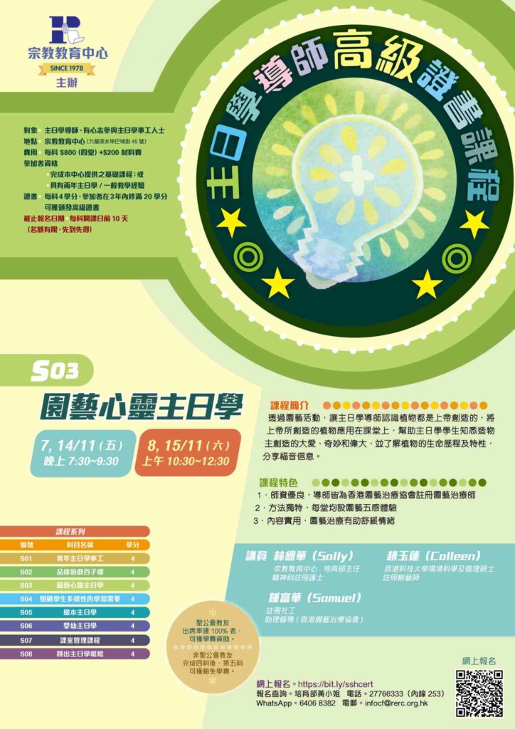 S08 | 跳出主日學框框 – 以新穎有趣的主日學教學設計,回應當前主日學的挑戰,培育新一代的信仰與靈命 | 2025年 9月19、26日(五) 9月20、27日(六) | 彭培剛法政牧師 (宗教教育中心主任、大主教培育顧問、美國波士頓大學牧職學(宗教教育)博士) 池馬美娜師母 (資深教會工作者及校牧) 張翠華校長 (香港聖公會基督顯現堂幼稚園校長) 左惠珊女士 (香港聖公會青山聖彼得堂主日學部長、聖公會青山聖彼得堂兆麟苑幼稚園主任) 何敏兒女士 (「以諾團契」兒童及少年事工導師) 林細華女士 (宗教教育中心助理主任、培育部主任、精神科註冊護士) |
