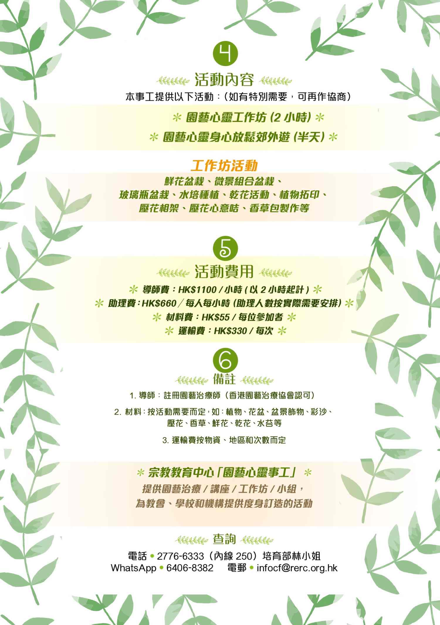 由2022年開始提供各種園藝心靈活動:香港書展/基督教聯合書展/教、牧、同工退修會/中、小學生學校活動/主日學導師、學生、家長工作坊,為教會、學校和機構提供度身訂造的活動。